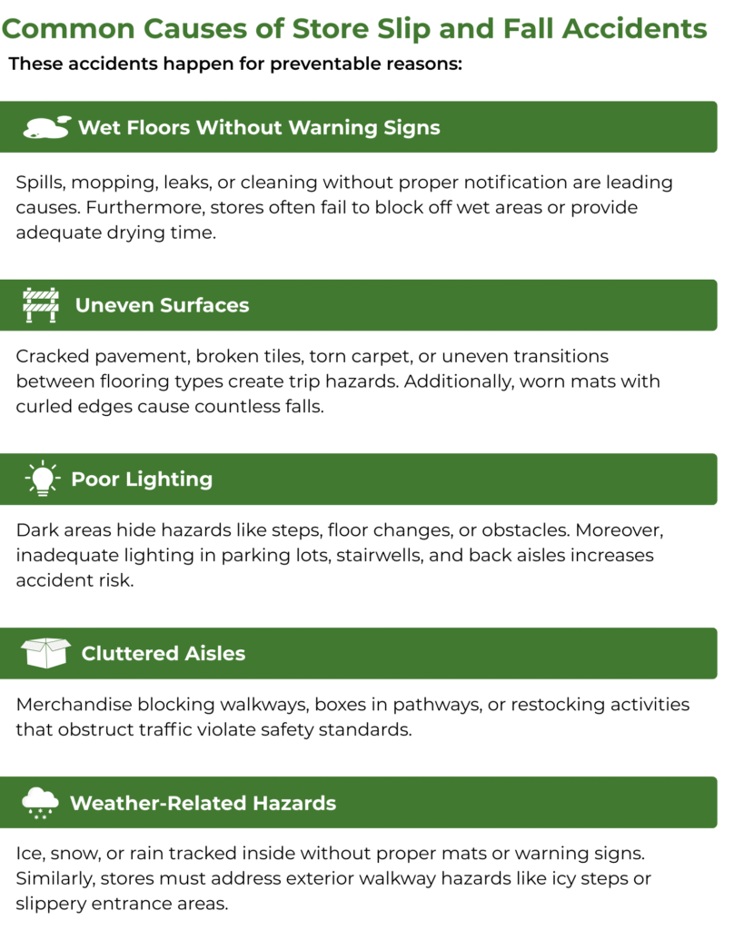 Quick Answer: If you slip and fall in a store, immediately report the incident to management, take photos of the hazard and your injuries, get witness information, seek medical attention, and contact an experienced premises liability attorney within 24 hours to preserve critical evidence and protect your legal rights.